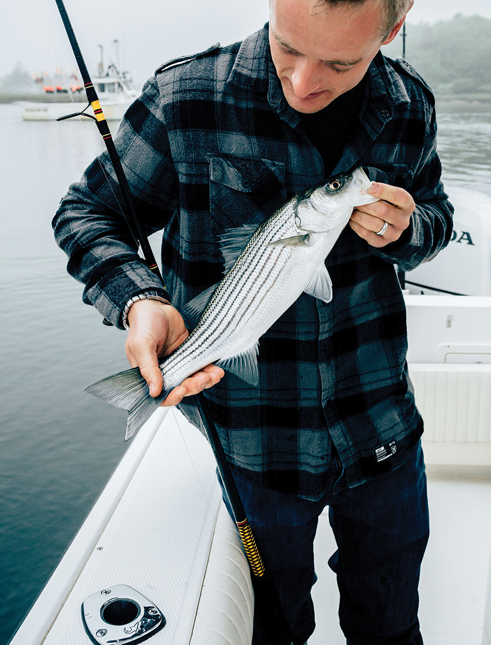 Sheldon Pope pulls a striper aboard the Striker in the Kennebunk River