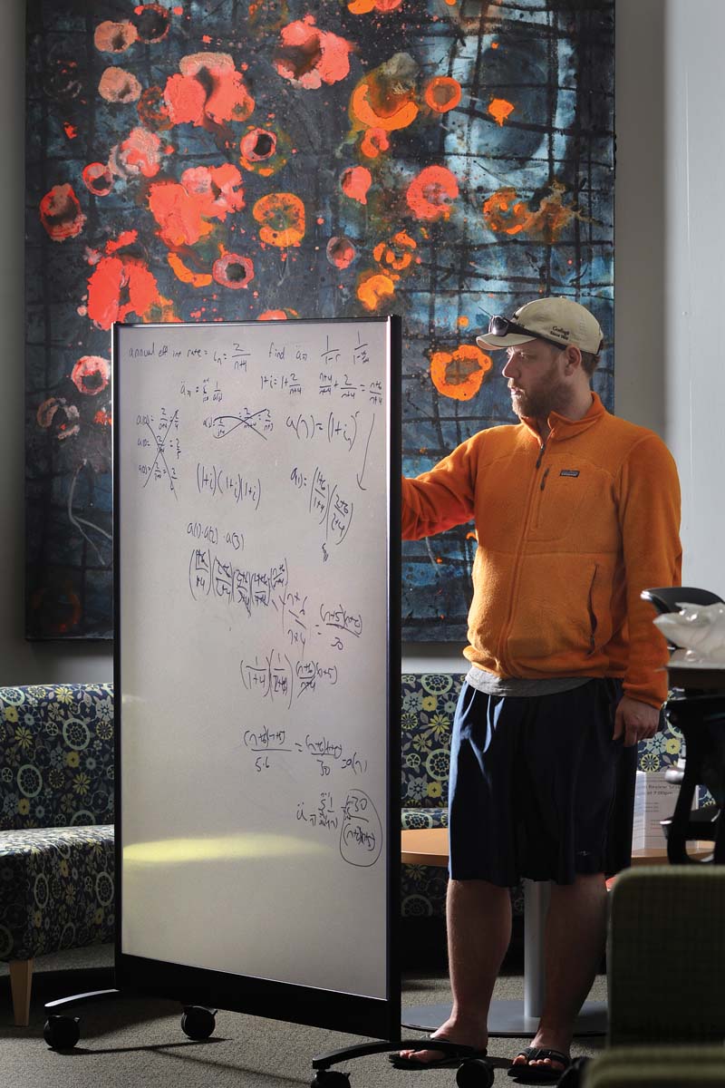 Studying complex math problems at the UMF Mantor Library is Nick Stringos.